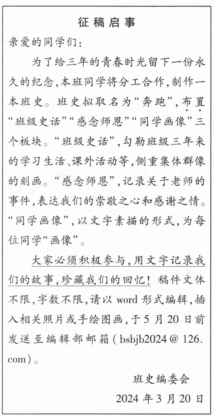 1. (2024,唐山一模)同学们准备编辑一本班史。下面是班史编委会起草的征稿启事,请审读。