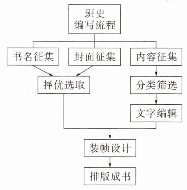[思维能力.梳理概括]为了纪念精彩的初中生活,班上要制作一本班史,请你根据下图,向同学们简要说明班史编写流程。要求:语言简洁流畅,条理清晰,不超过80字。