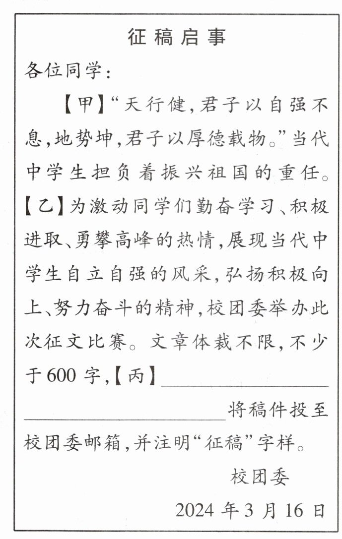 (2) 校团委将于2024年3月20日上午举行“笃学明志,自强不息”主题征文活动,征稿截止日期为2024年4月10日。请仔细阅读以下征稿启事,按要求作答。