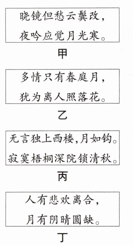 (2024,张家口一模) 某语文小组举行“古诗词中的月”主题探究活动,并搜集到下面一组诗词,请你完成如下任务。(6分)