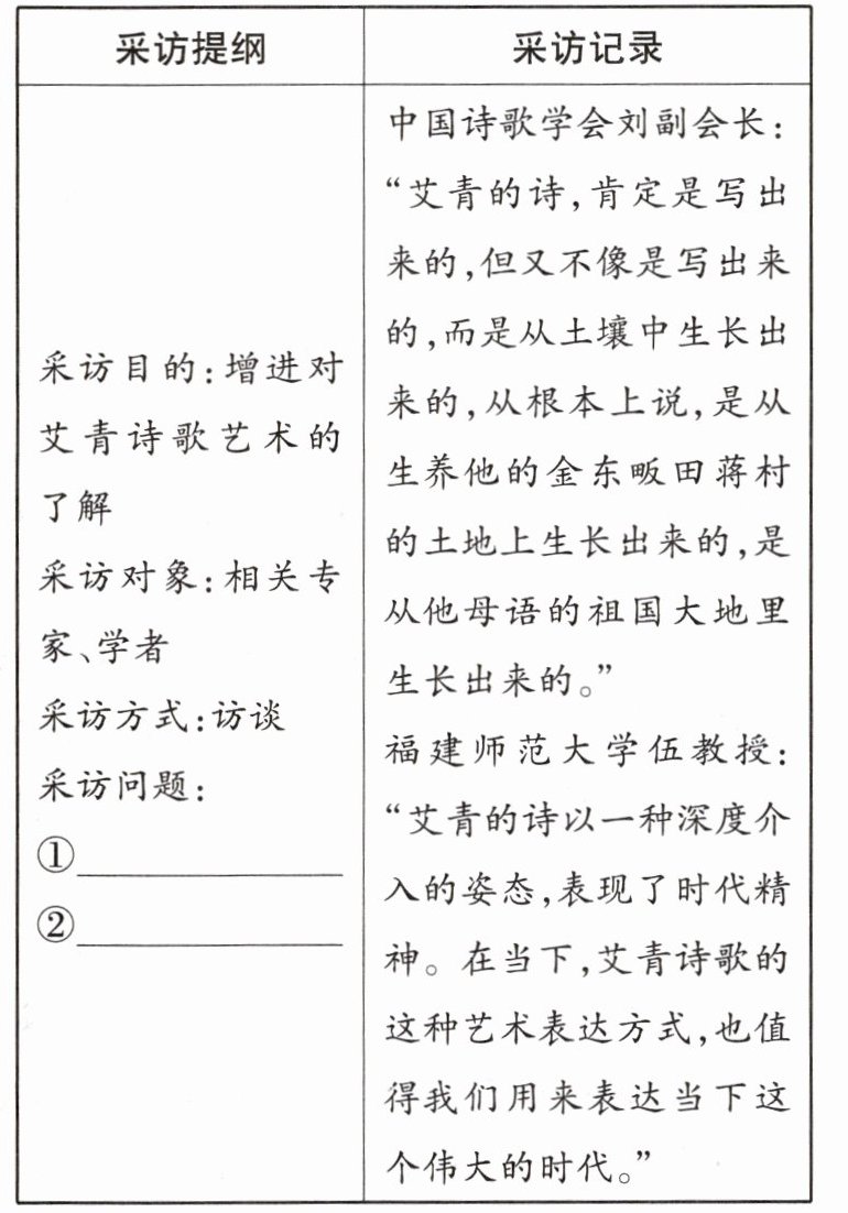 (3)示例:①刘副会长,您认为艾青的诗歌是如何创作出来的?