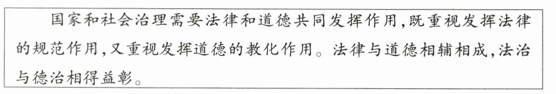 D 【解析】题干中,老师的话表明我国坚持依法治国和以德治国相结合的治国方略。分析可知,D意指通过依法治国来保证社会安定,以德行来启发人心,强调法治和德治相结合,正确;A意思是一个国家的法律制度,既不是天上掉下来的,也不是从地下长出来的,而是在人间社会发轫的,是顺应人的利益和愿望而产生的,强调法要体现人民的意志,不符合题意;B意思是天下大事,困难的不在于要制定什么法律,而在于立了法就一定要执行,强调严格执法,不符合题意;C意思是法律条例,是人民的性命,是治理国家的根本,强调法治的重要性,不符合题意。
