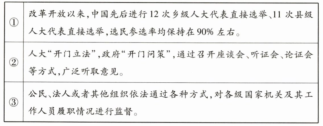 (2)①坚持党的领导,党始终坚持全心全意为人民服务。②坚持人民当家作主,发挥人民的主体作用,“有事好商量”。③坚持依法治国,增强法治意识等。