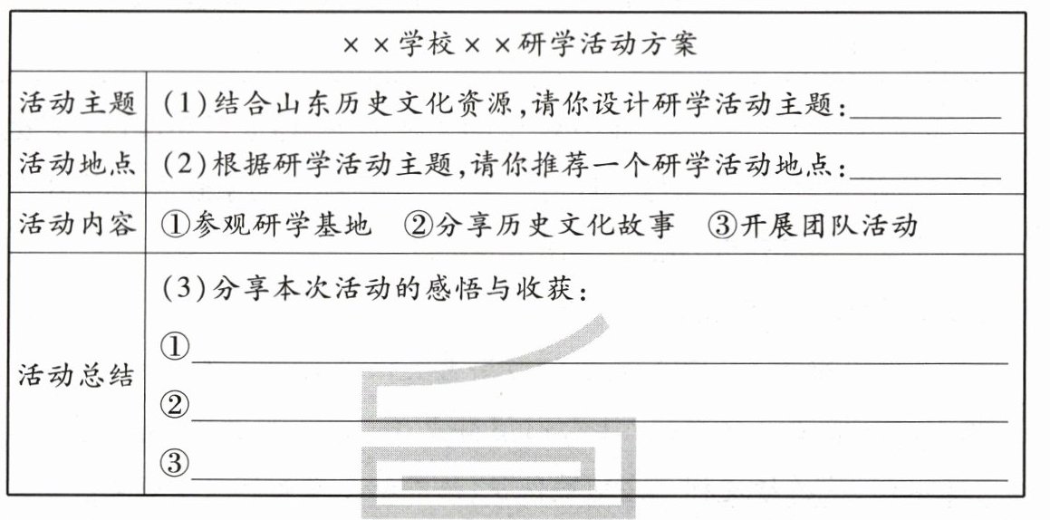 为了帮助学生了解和感受山东历史文化,学校决定组织一次“文化之旅”研学活动,向全校同学征集活动方案,请你参与活动并完成本次研学活动方案。