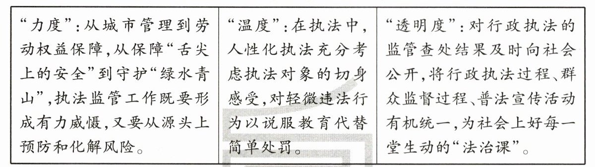 材料一 行政执法工作是社会治理的重要一环,同百姓生活息息相关。我国行政执法工作做到了“三度”,获得广泛好评。