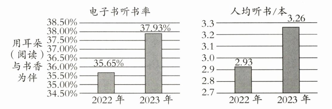 (1)现象:与2022年相比,2023年该省的电子书听书率和人均听书数量都有了提高。原因:我国科技创新能力在不断增强,科技创新为有声阅读的发展提供了技术支撑;有声阅读的丰富内容能满足不同人群对美好精神生活的需求。
