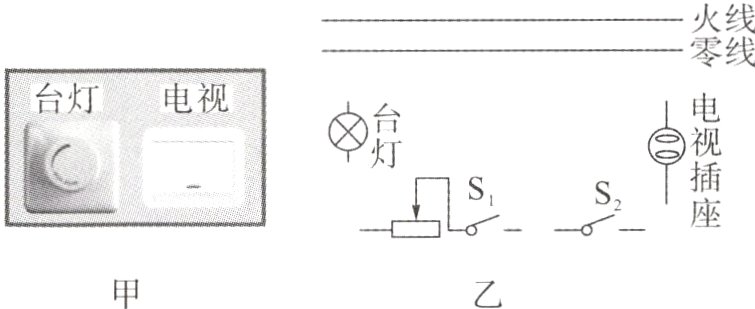 10. (2023.兰州中考)如图甲是宾馆床头柜上开关示意图,图乙是其控制的电路,其中S为旋钮开关,单独控制台灯的通断和亮度,S2为单独控制电视插座的开关.在图乙中将电路图连接完整,要求符合安全用电原则.