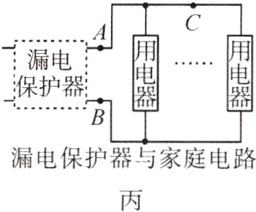 (3)为了保障安全,电工师傅在电路中安装上了漏电保护器。漏电保护器主要是用来对用电设备发生漏电故障或对有致命危险的人身触电时的保护。如图丙所示是安装了漏电保护器的家庭电路,当漏电保护器检测到通过图中A、B两处的电流不相等(即发生漏电)时,会迅速切断电路,从而起到保护作用。若维修人员不慎触碰图中C点发生触电情况,漏电保护器______(选填“会”或“不会”)切断电路;若人体电阻为10kΩ,触电时通过人体的电流为______mA。