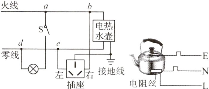 12. 如图是小聪家的部分电路和电热水壶的内部原理图。若小聪将电热水壶的插头插入电源的插座,然后闭合开关时,空气开关跳闸,则原因可能是________。(填序号)
