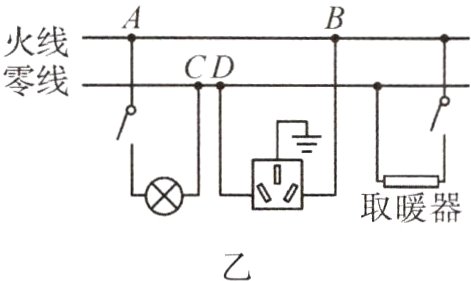 (2)如图乙所示是卫生间的电路。小明发现原本卫生间的电灯与取暖器均正常工作,当他在三孔插座上插入电热水器后取暖器突然停止工作,卫生间内电灯仍正常发光。于是,小明请来了电工师傅,师傅拔出电热水器的插头,用验电笔分别测试三孔插座的下排左右两孔,验电笔管均不发光。此时电路故障可能是______(填字母)。