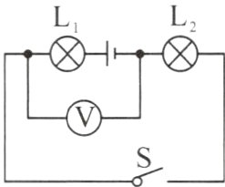 6. 小东连接的电路如图所示,他所用的电源是四节新干电池串联组成的电池组,当他将开关闭合后,L₁两端的电压为4V,则电压表的示数为 ( )