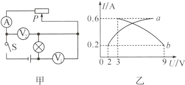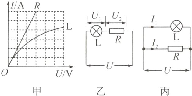 9. (2023.凉山州中考)如图所示,图甲是灯泡L和定值电阻R的I一U图像,将L和R先后以图乙、丙两种方式连在同一电源上.若图乙中U1:U2 = a,图丙中I1:I2 = b,则下列选项中不正确的是 ( )