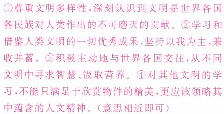 (2)请你根据材料二,说说我们应怎样对待世界各民族不同的文明。(至少答出三点)