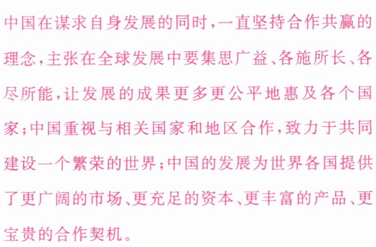 中国在谋求自身发展的同时,一直坚持合作共赢的理念,主张在全球发展中要集思广益、各施所长、各尽所能,让发展的成果更多更公平地惠及各个国家;中国重视与相关国家和地区合作,致力于共同建设一个繁荣的世界;中国的发展为世界各国提供了更广阔的市场、更充足的资本、更丰富的产品、更宝贵的合作契机。