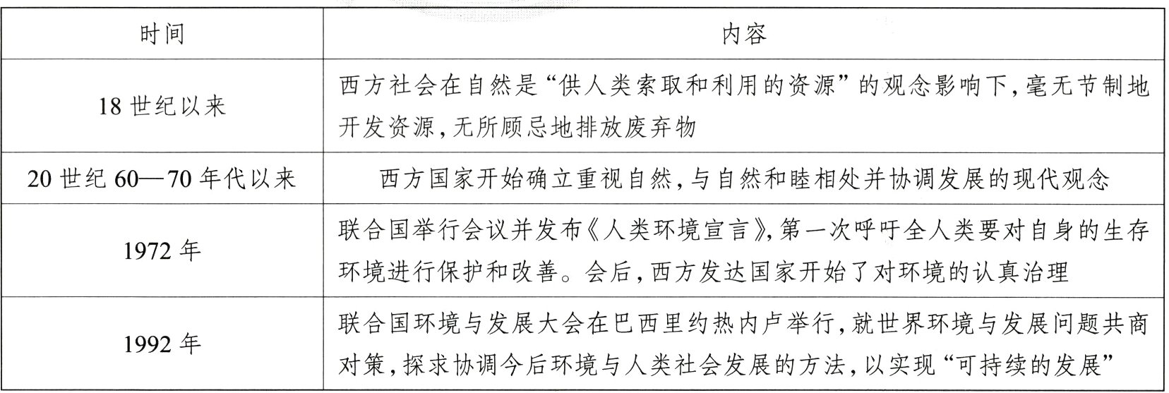 (2)由向自然无止境地索取转向对生态环境进行保护,与自然和谐相处。发布《人类环境宣言》,召开环境保护会议等。