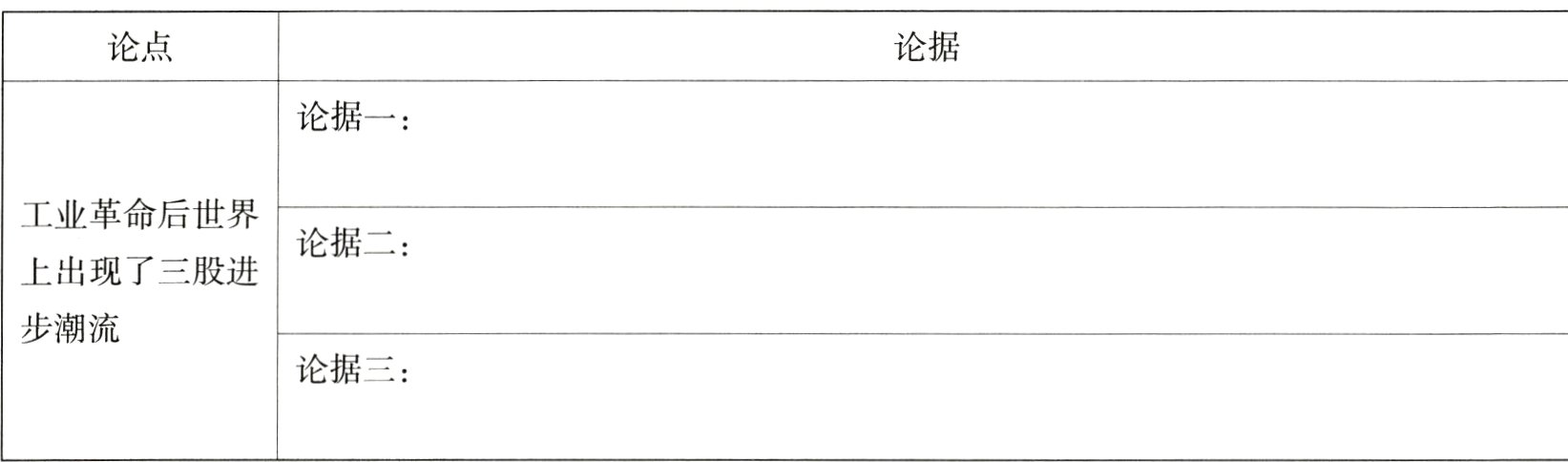 (3)论据一:工业革命从物质上增强了资本主义的力量 论据二:社会主义的思潮空前活跃起来 论据三:在这些活动的刺激下,民族运动更大规模地发展起来。