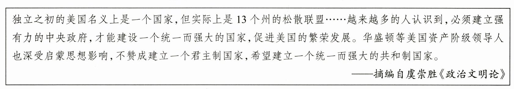 (1)第一小问,材料一中图1反映的是签署《独立宣言》时的场景。第二小问,根据材料“独立之初的美国名义上是一个国家,但实际上是13个州的松散联盟”可知,独立之初的美国国家体制的弊端是缺乏强有力的中央政府,阻碍美国经济的发展。第三小问,结合所学知识可知,为解决这一弊端,美国制定1787年宪法,依据分权制衡原则设计了一个联邦制共和国。第四小问,结合所学可知,图2人物是林肯,他的历史贡献是领导人民在美国内战(或南北战争)中取得胜利,维护了国家统一,废除了奴隶制,清除了资本主义发展的最大障碍,为以后美国经济的迅速发展创造了条件。