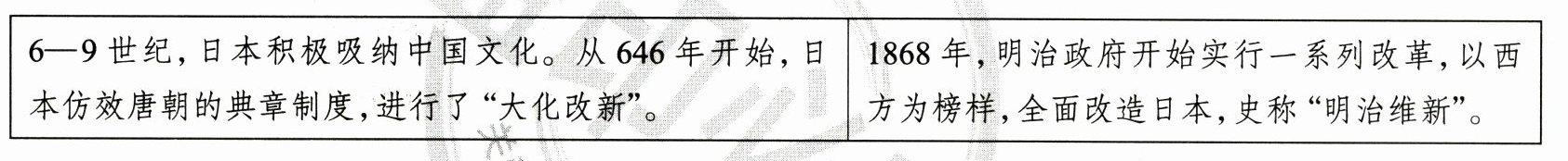 (3)第一小问,材料反映的是大化改新和明治维新。大化改新使日本发展成为一个中央集权制的封建国家,促进了日本经济的发展。明治维新成为日本历史的重大转折点。通过明治维新,日本迅速走上了发展资本主义的道路,实现了富国强兵,开始跻身资本主义强国之列。但日本强大起来以后,很快走上了对外侵略扩张的道路。第二小问,结合所学知识可知,日本两次改革的影响相似,都促进了日本经济的发展;措施相似,都加强了中央集3