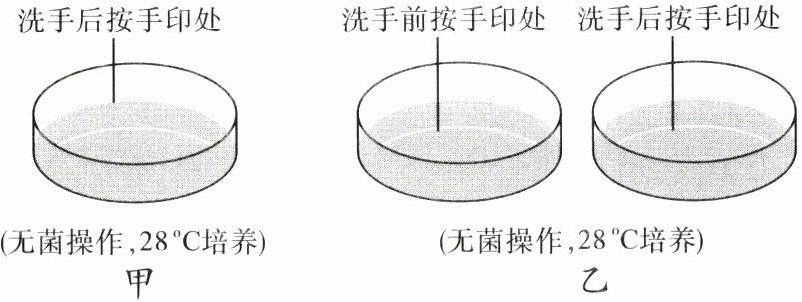 洗手看似简单,殊不知其中大有学问。某校学生兴趣小组的甲、乙两位同学利用盛有无菌培养基的培养装置,分别设计了洗手能减少手上细菌数量的验证实验:
