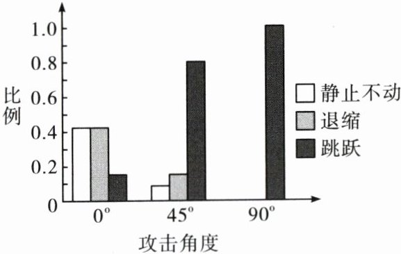 11.(苏州中考)某研究小组通过模拟捕食者对非洲蟾蜍的攻击行为,以研究非洲蟾蜍的逃避策略。该研究小组分别从0°、45°、90°对蟾蜍抛掷易拉罐,以模拟捕食者从不同方向对其进行攻击,观察并记录蟾蜍的逃避方式及相关比例,如图所示。有关叙述错误的是 ( )