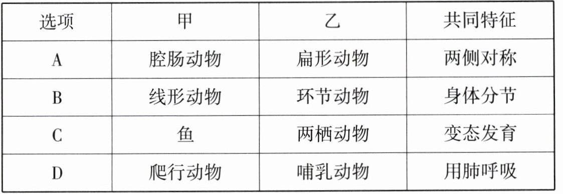 1.(聊城中考)下表中关于甲和乙两类动物共同特征的描述,正确的是 ( )