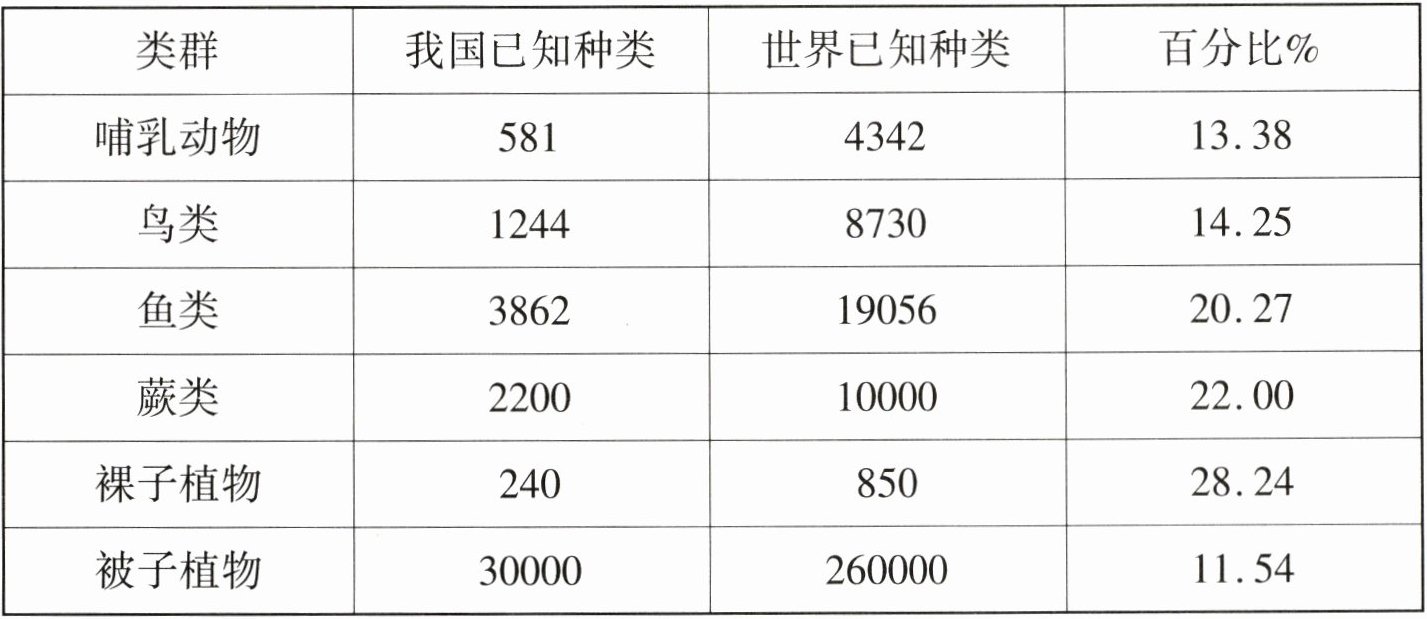 32.综合应用题:南靖乐土亚热带雨林自然保护区是福建省面积最小的一个自然保护区,保护区内气候条件优越,属于亚热带季风气候,区内有国家一级保护植物刺桫椤,二级保护植物观光木、闽楠等,还有云豹、苏门羚等14种珍稀动物,以及94种常见昆虫。生物多样性正受到越来越多人的重视。如表为中国生物多样性国家研究报告的部分数据(表中的“百分比”是我国已知种类占世界种类的百分比)。(8分)