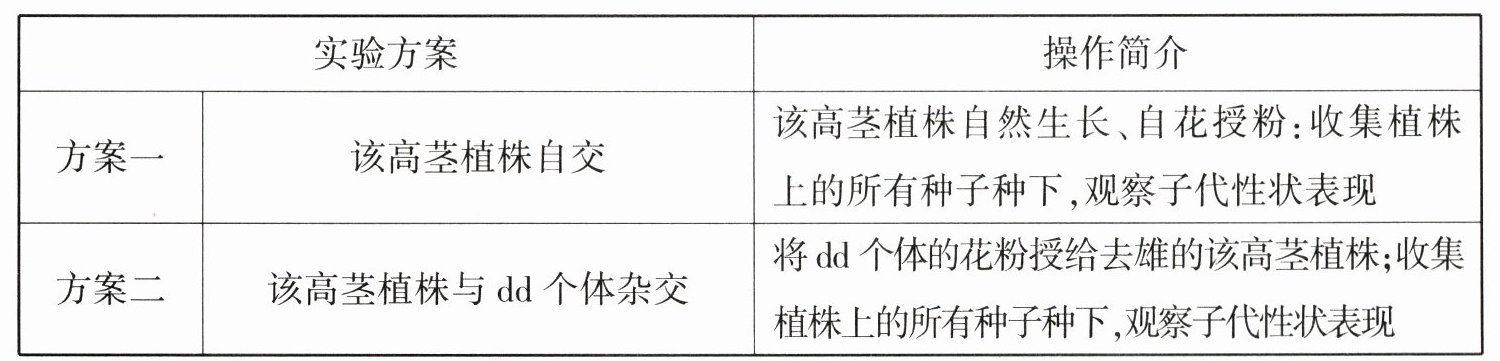 (3) 现有子一代高茎植株一棵,即将形成花芽。欲确定该高茎植株的基因组成,请选择下表中操作上最简单的方案并说明理由________________________。