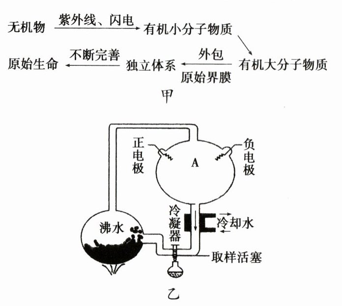 17.如图中甲图是生命起源化学进化过程的示意图;乙图为米勒研究生命起源的化学进化过程的一个模拟实验装置。请据图回答问题。(10分)
