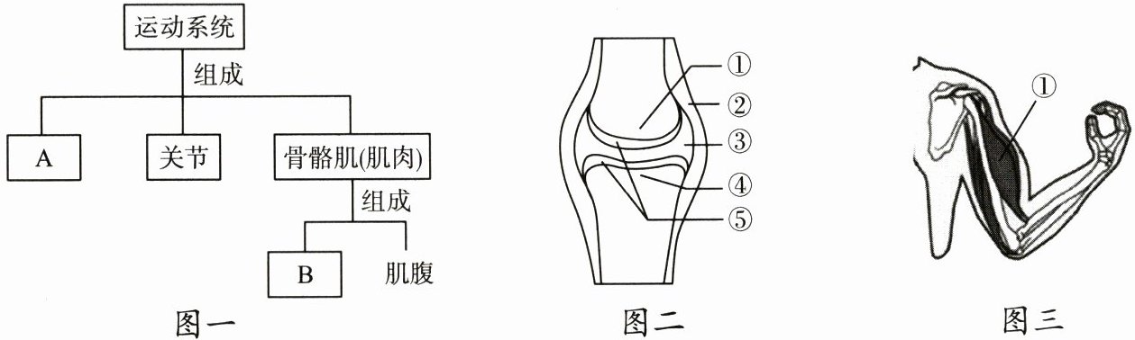 (3)图三表示屈肘动作,此时[①]_______处于_______状态。请写出图三中的关节名称______________________________(至少写出2个)。