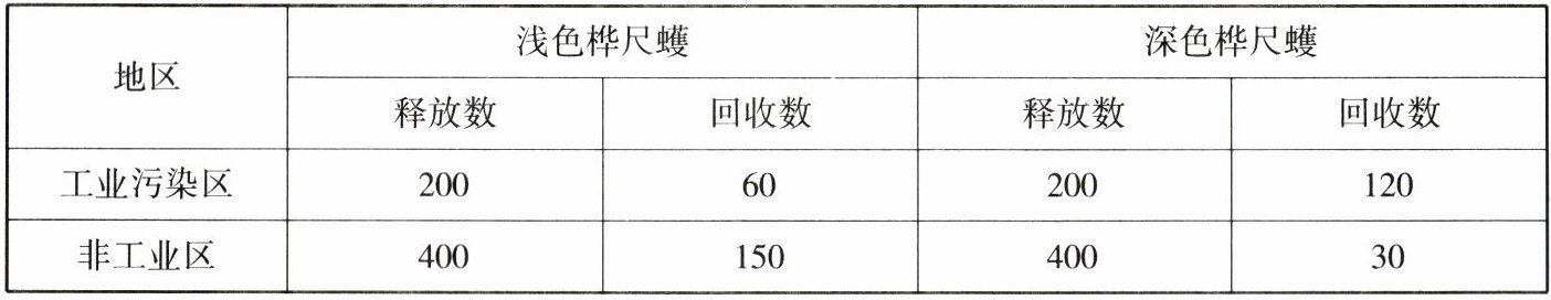 19.(攀枝花中考)生物学家做了如下实验,将深色桦尺蠖和浅色桦尺蠖分别进行标记,然后放养于工业污染区和没有污染的非工业区。经过一段时间以后,将释放的桦尺蠖尽量收回,统计结果如表:(15分)