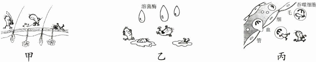 19. (铁岭中考)下面的三幅漫画的寓意是人体在进化过程中形成的对病原体的防御功能,请分析图片并回答下列问题。(7分)