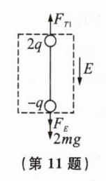 11. 在场强为$E$、方向竖直向下的匀强电场中,有两个质量均为$m$的带电小球$A$和$B$,电荷量分别为$ + 2q$和$ - q$,两小球间用长为$l$的绝缘细线连接,并用绝缘细线悬挂在$O$点,如图所示.平衡时,细线对悬点$O$的作用力多大?