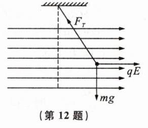 12. 如图所示,用一条绝缘轻绳悬挂一个带电小球,小球质量为$1.0\times10^{- 2}\ kg$,所带电荷量为$ + 2.0\times10^{- 8}\ C$.若加一水平方向的匀强电场,平衡时绝缘绳与竖直线成$30^{\circ}$角,绳长$L = 0.2\ m$.$(g$取$10\ m/s^{2})$