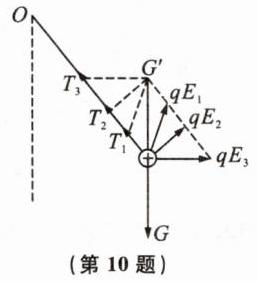 10. 如图所示,绝缘细线一端固定于$O$点,另一端连接一带电荷量为$q$、质量为$m$的带正电小球.要使带电小球静止时细线与竖直方向成$\alpha$角,可在空间加一匀强电场,则当所加的匀强电场沿什么方向时可使场强最小?最小的场强多大?这时细线中的张力多大?