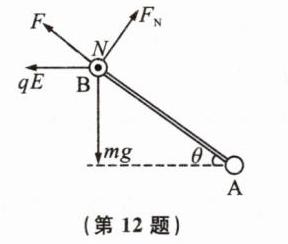 12. 如图所示,有一水平向左的匀强电场,场强$E = 1.25×10^4N/C$,一根长$L = 1.5m$、与水平方向的夹角$\theta = 37^{\circ}$的光滑绝缘细直杆$MN$固定在电场中,杆的下端$M$固定一个带电小球$A$,电荷量$Q = +4.5×10^{-6}C$;另一带电小球$B$穿在杆上可自由滑动,电荷量$q = +1.0×10^{-6}C$,质量$m = 1.0×10^{-2}kg$.将小球$B$从杆的上端$N$处静止释放,小球$B$开始运动.问:(静电力常量$k = 9.0×10^9N·m^2/C^2$,$g$取$10m/s^2$,$\sin37^{\circ}=0.6$,$\cos37^{\circ}=0.8$)