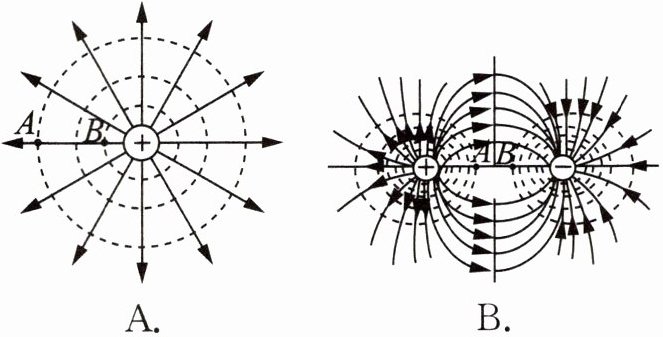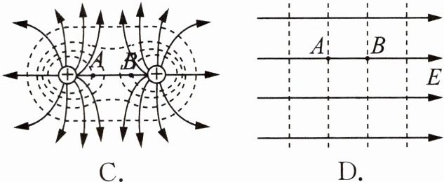 7. 电场中有A、B两点,$E_{A}$和$E_{B}$分别表示A、B两点的电场强度的大小,$\varphi_{A}$和$\varphi_{B}$分别表示A、B两点的电势,满足$E_{A}=E_{B}$且$\varphi_{A}=\varphi_{B}$的是 ( )