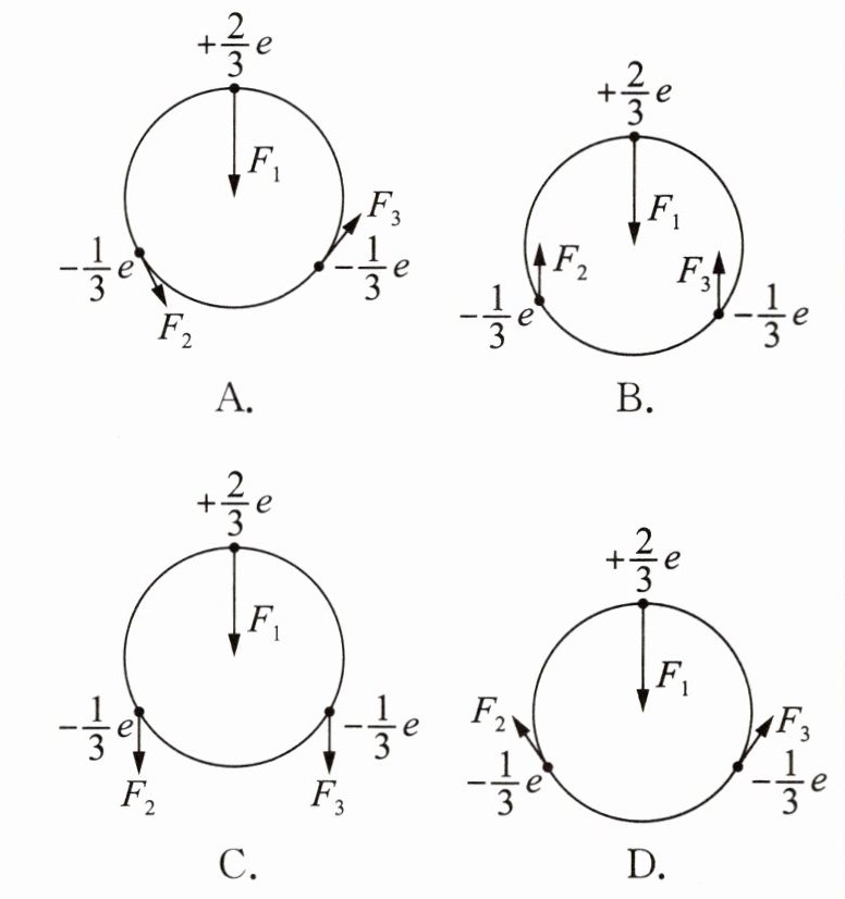 1. 根据现代物理实验,中子内有一个电荷量为+$\frac{2}{3}e$的上夸克和两个电荷量为-$\frac{1}{3}e$的下夸克.假设三个夸克都在半径为r的同一圆周上,如图所示,则下列四幅图中能正确表示出各夸克所受静电作用力的是 ( )