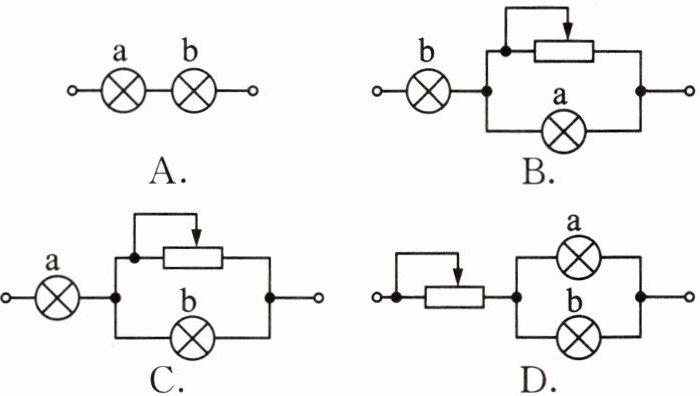1. 有额定电压都是110 V,额定功率$P_{a}=100\ W$,$P_{b}=40\ W$的灯泡两盏.若接在电压为220 V的电路上,使两盏灯泡均能正常发光,且消耗功率最小的电路是( )