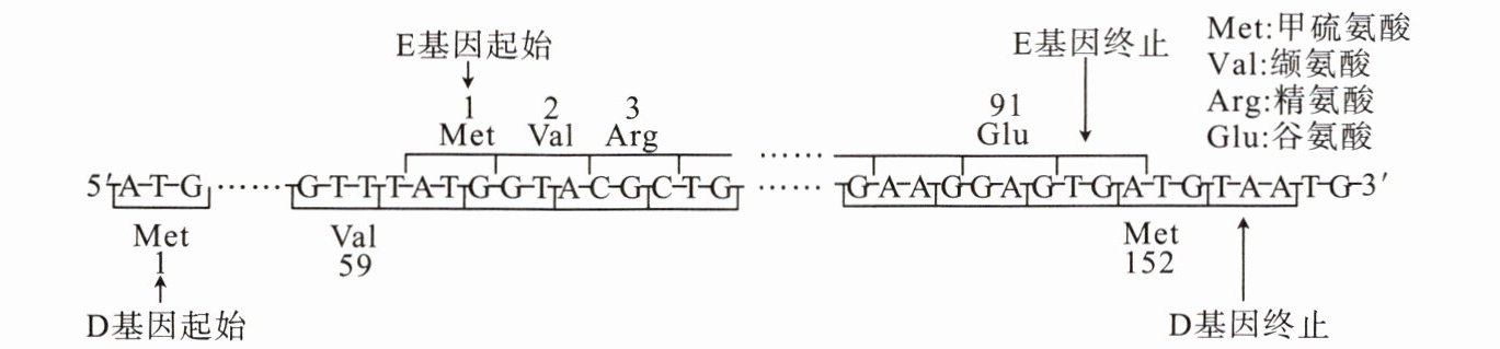 B 解析 根据图示信息,D基因编码152个氨基酸,但D基因包含终止密码子对应序列,故应包含459个碱基,A错误;分析图示信息,E基因中编码第2个和第3个氨基酸的碱基序列为5'-GTACGC-3',根据DNA分子两条链反向平行可知,其互补DNA 序列是5'-GCGTAC-3',B正确;DNA的基本组成单位是脱氧核糖核苷酸,噬菌体ΦX174的DNA复制需要DNA聚合酶和4种脱氧核糖核苷酸,C错误;E基因和D基因的编码区序列存在部分重叠,但重叠序列编码的氨基酸序列不相同,D错误。