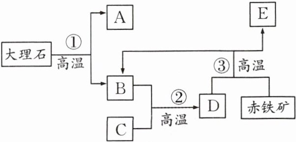 7. 工业上以大理石和赤铁矿为主要原料制取A和E,其转化关系如下图所示,已知C、E为单质。