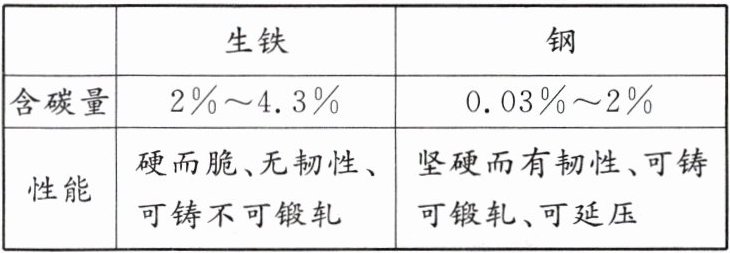 14. 生铁和钢都是铁的合金。下表对生铁和钢的成分、性能进行了比较。