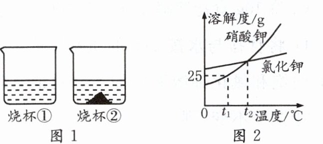 13. t₁℃时,将等质量的硝酸钾和氯化钾分别加入到盛有100g水的两个烧杯中,充分搅拌后现象如图1所示,硝酸钾和氯化钾的溶解度曲线如图2所示。