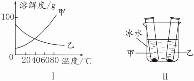 5. 甲、乙两种固体纯净物的溶解度曲线如图Ⅰ所示。在常温下,先在两支试管里分别装入甲、乙两种物质的饱和溶液(试管底部均有未溶解的固体),再放进盛有冰水的烧杯里(如图Ⅱ)。下列说法正确的是 ( )
