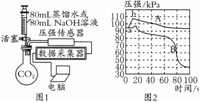 大,1体积的水能溶解1体积的二氧化碳,若二氧化碳不与氢氧化钠反应,压强应相差不大,B曲线压强减少的更大,则由实验1得到的图像是A曲线,实验2得到的是B曲线,故正确;B.A 曲线中ab段上升,是因为加液体后,短时间内气体被挤压,导致压强增大,而不是使烧瓶内$CO_{2}$分子数增多,故错误;C.由曲线