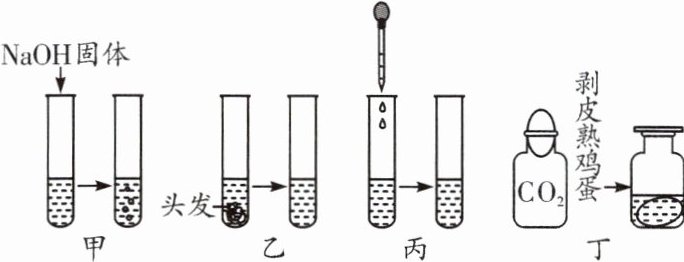 B. 乙:将少量头发加入热的浓$NaOH$溶液中,头发逐渐溶解消失