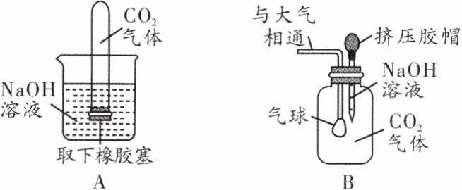 探究1 为探究$CO_{2}$和$NaOH$是否发生了化学反应,王强设计了如图所示的A、B实验,验证$CO_{2}$与$NaOH$溶液发生了化学反应。实验现象:A中试管内液面上升,B中气球胀大。