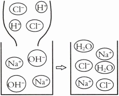 $NaOH + HCl \xlongequal{\;\;} NaCl + H_2O$ $Na^+$、$Cl^-$ 氢离子与氢氧根离子结合生成水