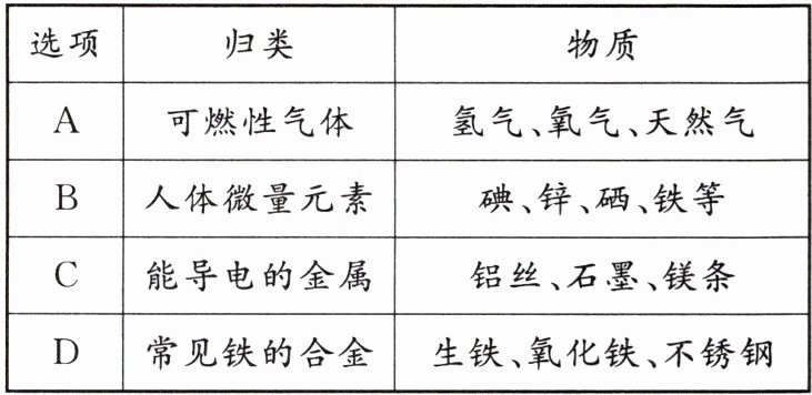 B[解析]A.氢气和天然气均具有可燃性,氧气具有助燃性,不具有可燃性,故错误;B.碘、锌、硒、铁都属于微量元素,故正确;C.铝和镁均属于金属,均具有良好的导电性,石墨具有良好的导电性,但是石墨属于非金属,故错误;D.生铁、不锈钢均是铁的合金,氧化铁属于金属氧化物,不是合金,故错误。