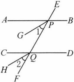 解:AB//CD,PG//QH。理由如下:因为∠1与∠2是同位角,且∠1=∠2,所以PG//QH。因为PG平分∠APQ,QH平分∠CQF,所以∠APQ=2∠1,∠CQF=2∠2。所以∠APQ=∠CQF。所以AB//CD。