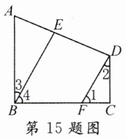 15. 如图,AB⊥BC,∠1 + ∠2 = 90°,∠2 = ∠3。BE与DF平行吗?为什么?